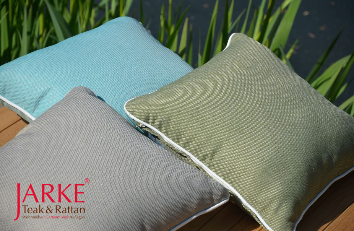 Alle Auflagen & Kissen haben einen umlaufenden Keder; bei den Hochlehner Auflagen & Sitzkissen ist dieser Ton in Ton, d.h. aus dem gleichen Stoff. Die Zierkissen verfügen über einen weißen Keder, siehe Foto. Vorteilhaft mit Reißverschluss ausgestattet, somit waschbar.
