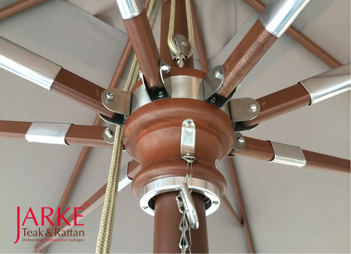 Der Stamm und alle Streben sind aus Hartholz, der sogenannte Streben-Stern & Schirmspitze sind aus Kunststoff. Alle Schrauben und Verbindungsstücke aus hochwertigem Edelstahl. Der Vorteil: alle Streben sind verschraubt und somit austauschbar/ reparabel.